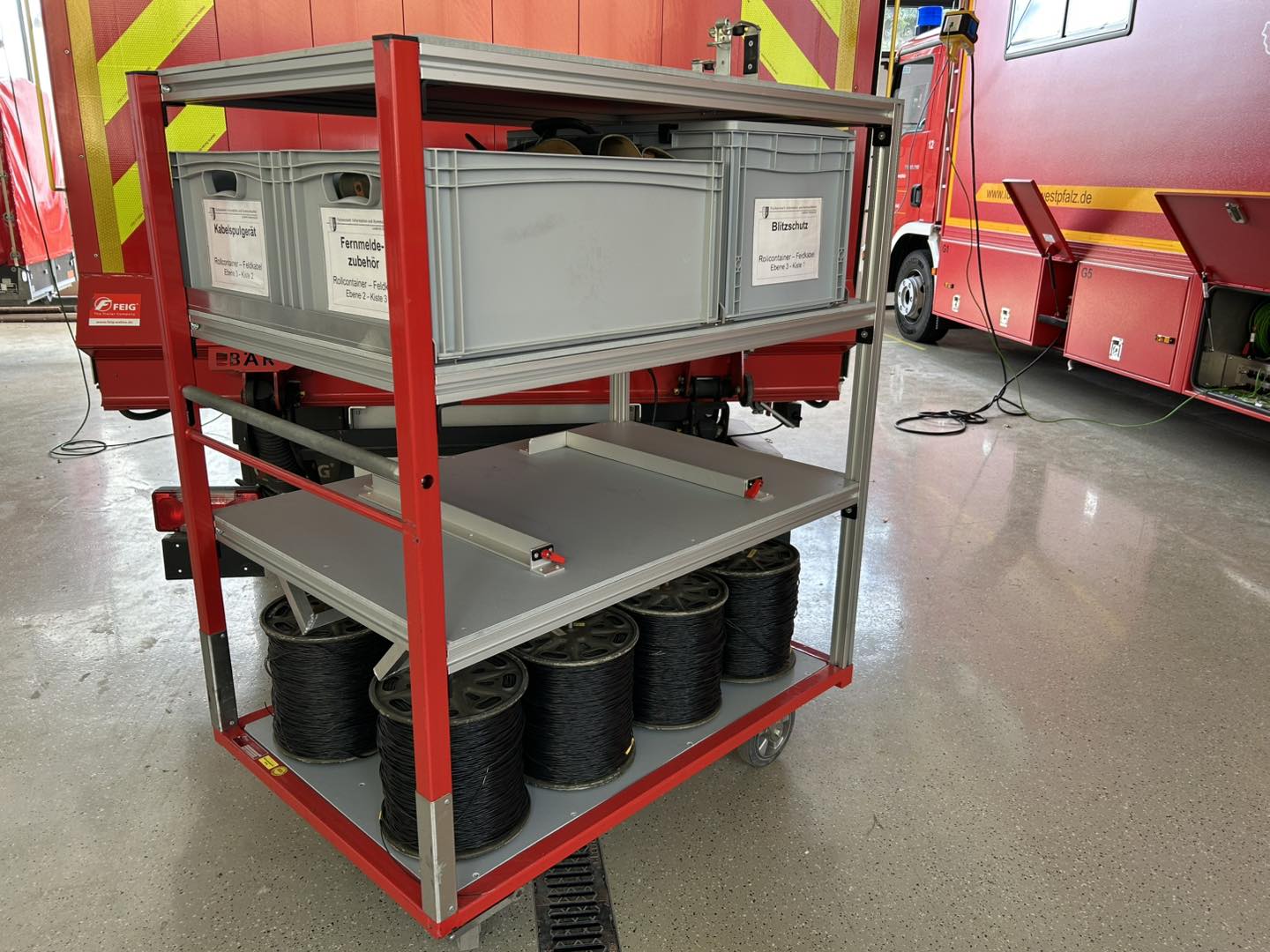 Der Rollcontainer Feldkabel ist ein Sonderbau und sicherlich weit und breit ein Einzelstück. Auf ihm sind ein Großteil der Materialien verstaut die wir zum Feldkabelbau benötigen.